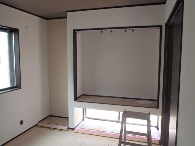 ・内装仕上げ工事、クロス下地パテを終え、天井・壁クロス 貼りを進めています。 クロスが貼られると、部屋の印象が変わり仕上がりが楽しみ となります。 ・電気・衛生器具付けを予定しています。持込み器具など準備 をお願いします