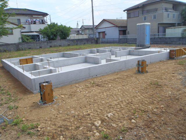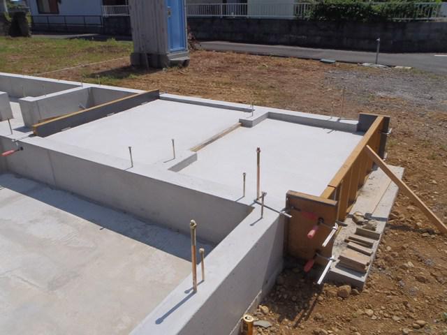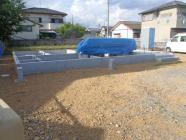 ・基礎工事、玄関・ポーチタイルコンクリートを打ち、基礎廻り埋め戻し 整地し基礎工事完了となり、先行外部配管埋設を行いました。 ・上棟に向け、土台据え、床下地組み、構造材・下地木材搬入 と準備を進めていきます。