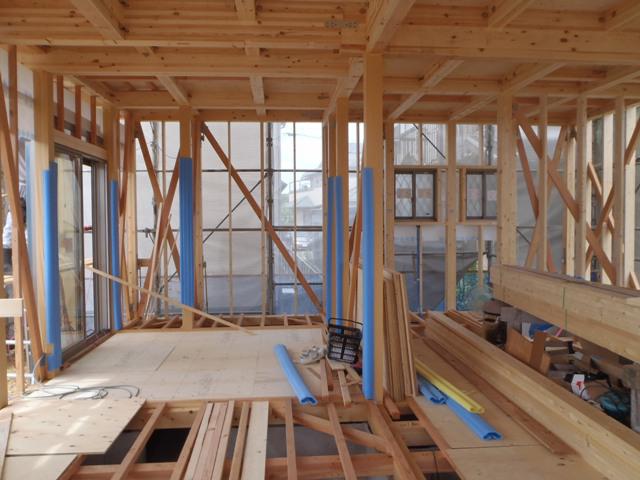 木工事(1階床断熱材入れ、下地合板本締め、外部胴縁、他)