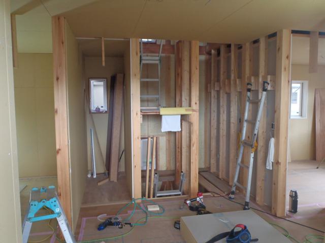 木工事(壁下地合板及びプラスターボード貼り、窓枠組立・