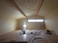 ・外部木部、軒天塗装を終え板金工事(破風鼻隠し)樋掛けを 行っています。台風18号進行状況が心配ですが外部足場 シートをたたみ資材養生、準備をしました。 ・内部木工事、2階間仕切り壁を進め、小屋裏、床フローリング、 天井・壁ボード貼りに取り掛かりました。