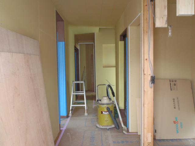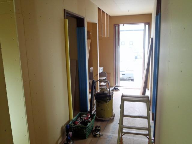 ・内部木工事、廊下・洗面所の間仕切り・ドア開口枠造作を進め