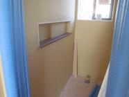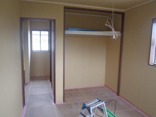 ・内部木工事、和室造作を終え、幅木・廻し縁取付、玄関収納 取付を進み、建具吊込みを行えば木工事完了となります。 棟梁の野末さんが上棟準備より約2カ月腕を揮い、木工事を まとめて頂きました。 ・内装クロス下地に入ります。プラスターボードジョイント部、ビス穴を クロスパテにて下地処理を行います。