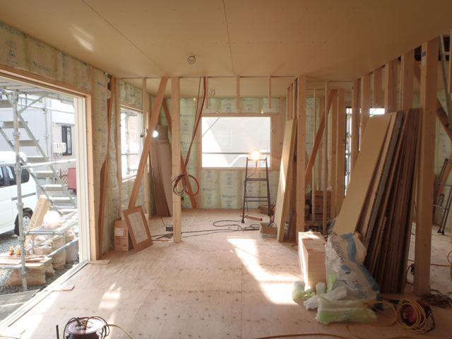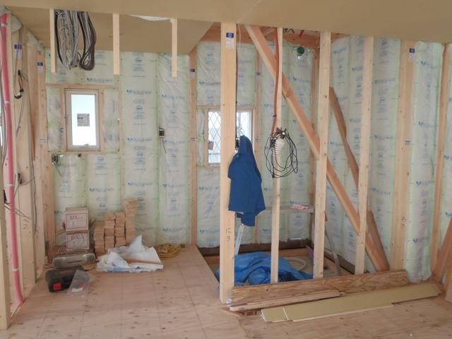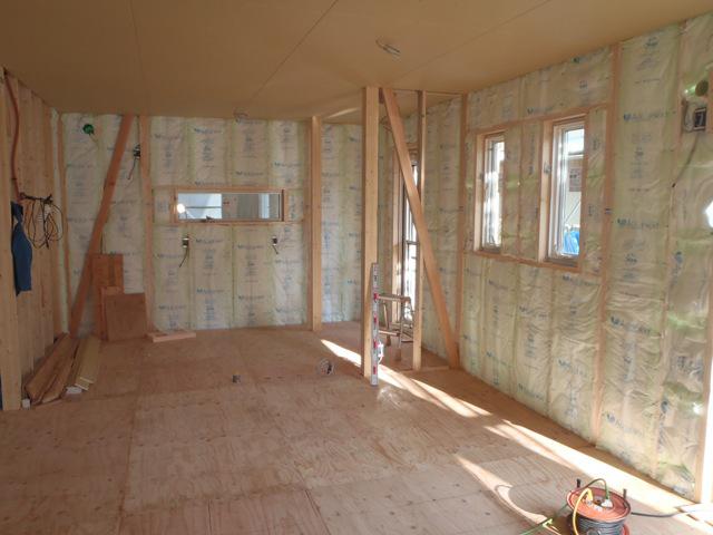 ☆先週の工事☆ 木工事(1階床下地合板、天井ボード貼り、サッシ取付、壁 断熱材入れ、他) 外壁下地シート貼り ☆今週の予定工事☆ 木工事(床フローリング貼り、壁下地、合板・プラスターボード貼り 他) 保証機構、外装下地検査