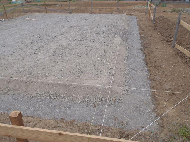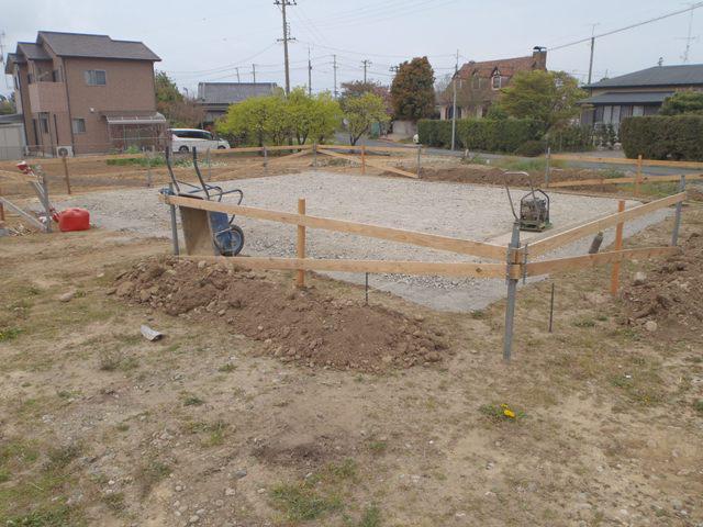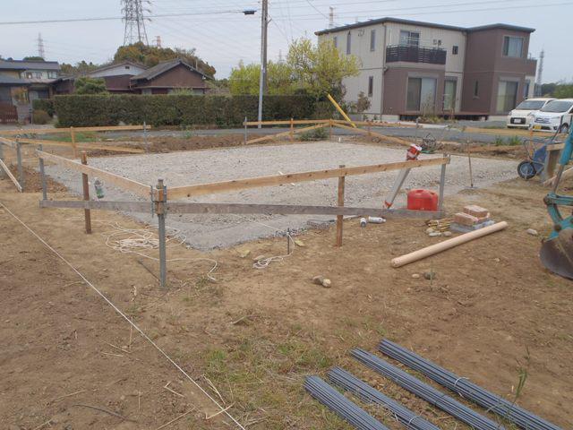 ・確認申請が受理され敷地不陸を整え、基礎工事に着手しま した。 ・建物基礎の基準となり位置・高さ出し(丁張り)、掘削、 砕石地業を進めています。基礎ベース型枠組み、鉄筋加工 及び鉄筋組へと進めていきます。