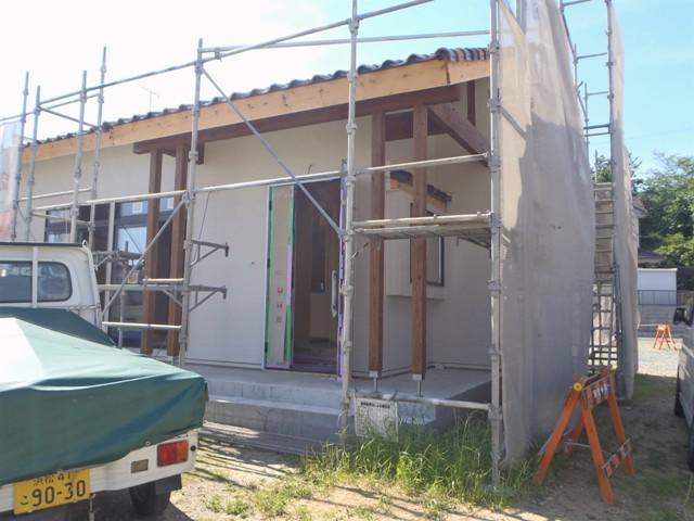 打ち終え完了となり外部軒天塗装・化粧梁り・柱・塗装を