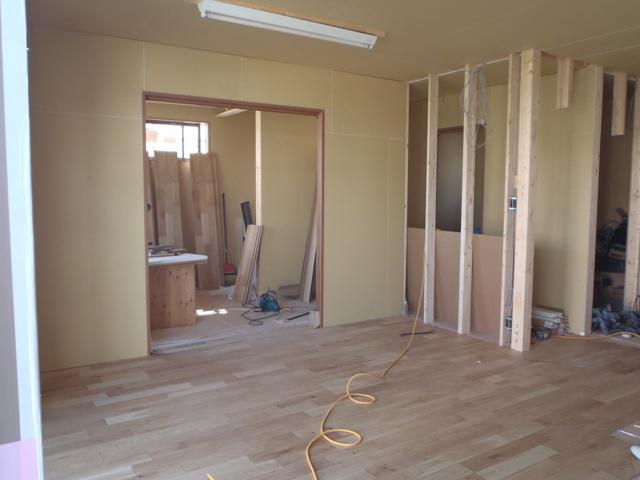 ・内部木工事、床フローリング貼りを終えた部屋よりドア