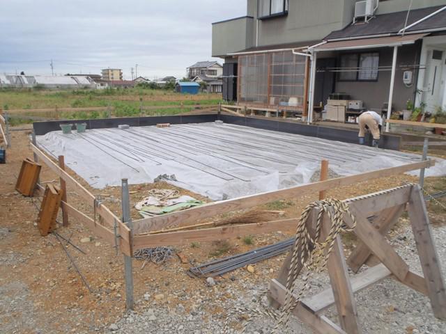 ・基礎工事、砕石地業、土間シート敷き、ベース型枠組み、
