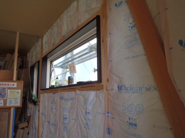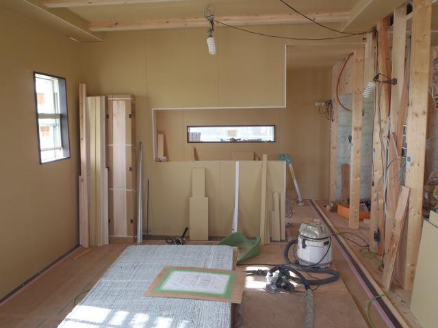 1階窓枠取付、壁プラスターボード貼りが進め、ドア開口枠組み