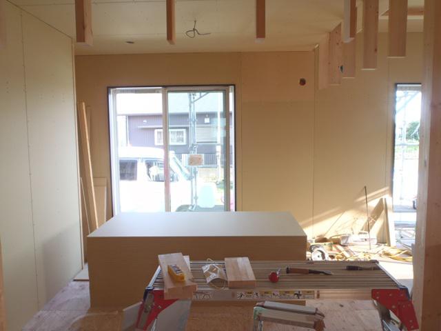・内部木工事、LDK床フローリング貼り及び床養生を敷き込み、