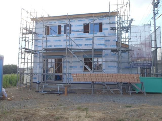 を建物を覆うように貼り終え外壁下地木材打ち、内部天井