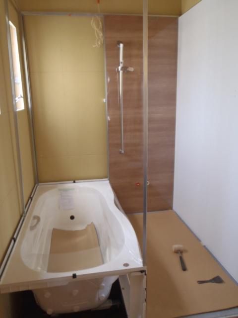 ・木工事、1階天井ボード貼り、外装下地検査を受け、外壁 下地材打ち、1階床フローリング貼り、ドア開口枠組み立てと 内外部造作を進めています。 ・3日、ユニットバス据え付けを行いました。