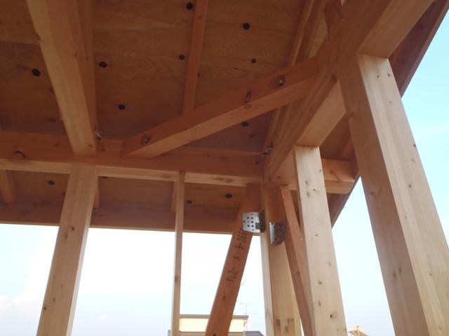 ・上棟おめでとうございます。台風12号の影響が心配でしたが 柱・梁の構造材組み、屋根小屋組みを行いました。下屋下地 合板張り、建物の耐力壁となる筋カイ及び間柱入れ、構造材 金物取付を行っています。