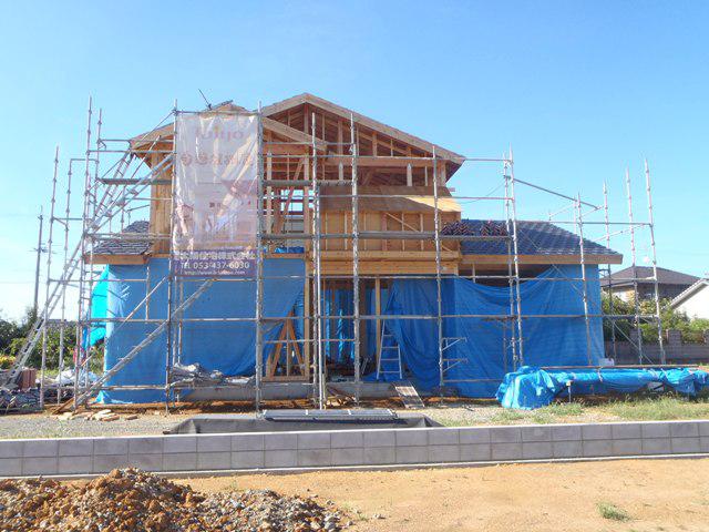 ・屋根工事、瓦材を荷揚げし柱・梁に加重が掛かりました。 瓦葺きを進めていきます。 ・木工事、1階床下地を本締めしベランダ下地、窓サッシ開口 造作・サッシ取付を行っています。