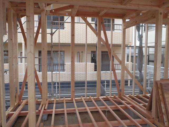 ・上棟おめでとうございます。柱・梁の構造材組み、屋根小屋 組み、屋根下地板貼りまで行うことができました。 ・建物の耐力壁となる筋かい及び間柱入れ、構造金物取付を行 っています。ベランダ下地、FRP防水、窓サッシ開口造作を 進めています。