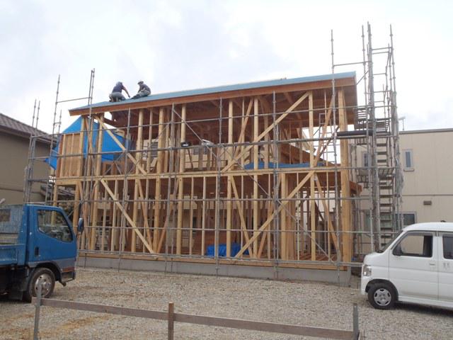 ☆先週の工事☆ 上棟 木工事(筋かい・間柱入れ、構造金物取付、ベランダ 下地、他) 屋根下地ルーフィング葺き ☆今週の予定工事☆ 木工事(ベランダ下地、窓サッシ造作、軒天下地組み、他)