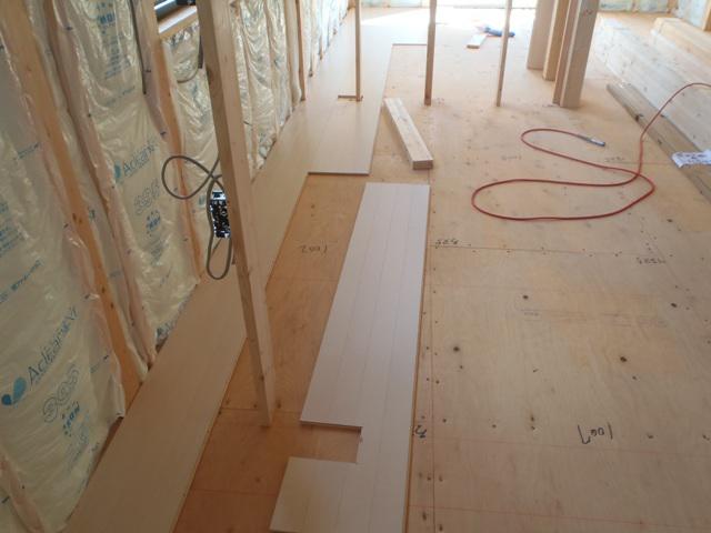 ・内部木工事、床フローリング貼りに取りかかりました。床貼りを 終えた部屋より床養生を敷き並べます。 ・外壁サイディング工事に入ります。 建物角コーナー材、スタート 金具を取付平板サイディング材を張り進めています。
