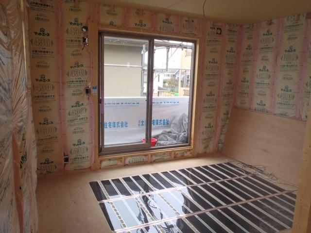 ・木工事、軒天下地組み及び軒天ボード貼りを終え、内部壁 断熱材入れ、1階天井ボード貼りに入りました。床暖房シート が搬入されシート取付及び配線を行っています。