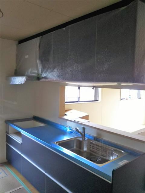 ・5日システムキッチン据付を行い養生をかけてありますので外して