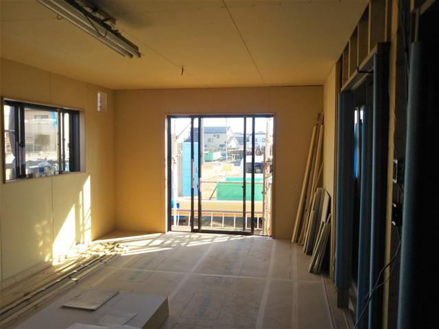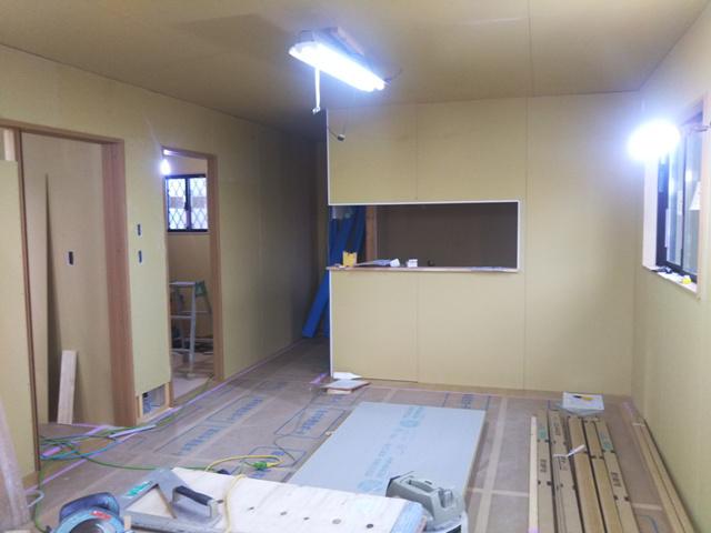 ご覧ください。内部木工事、1階壁おおまかな部分を貼り