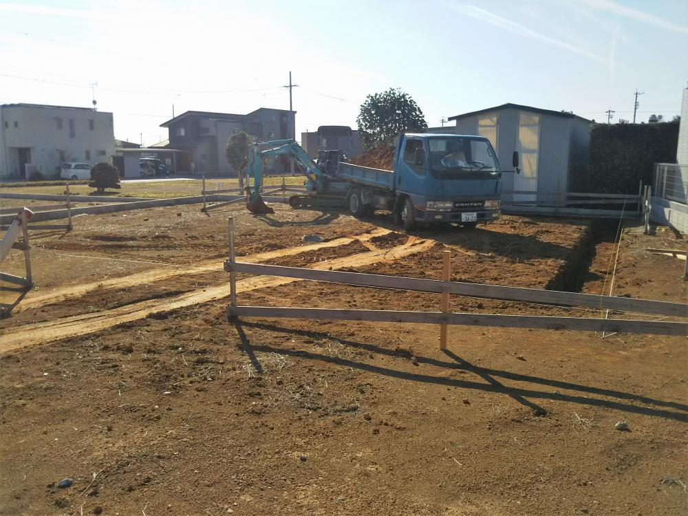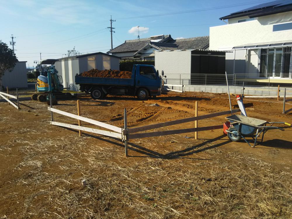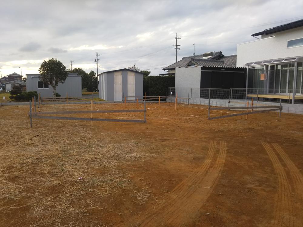・地鎮祭、雨が降りだしそうで心配でしたが無事に式典を終える事が出来ました。 ・基礎工事に着手しました、建物基礎の基準となる位置、高さ出し(丁張)、掘削作業に入りました。