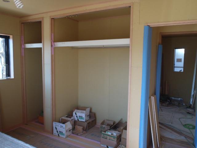 ・外壁サイディング貼り、ポイントサイディングを残し建物9割程貼り終えました、窓周り・軒天取り合い部コーキング打ちにも取り掛かります。 内部木工事、ドア開口枠取付、壁下地ボード貼りを終え、幅木・回し縁取付進めています、階段造作・建具吊り込みを行えば木工事完了となり、内装仕上げ工事へと入ります。