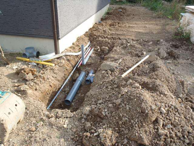 解体 外部給排水管埋設を進め、エコキュート配管及びベース