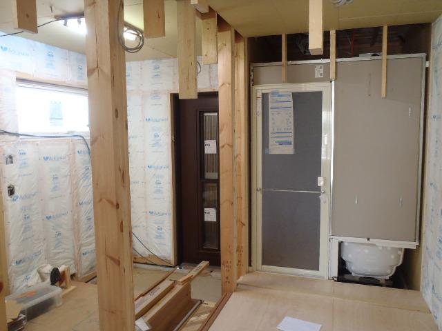 ドア開口枠組立しながら取付を進め壁ボード貼りを行って行き
