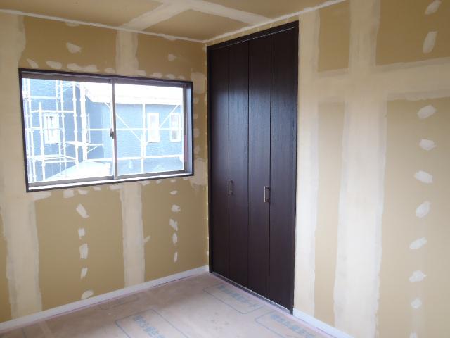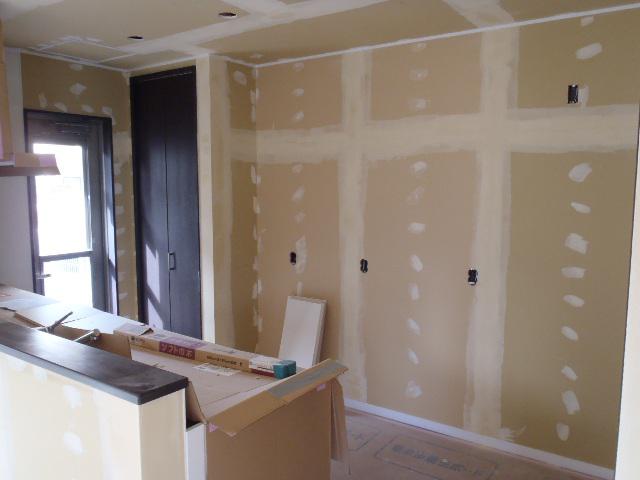 ・内装工事、クロスパテ下地処理を終えクロス貼りへと入ります。 ・外部 換気フード・TVアンテナを取付、足場解体を行い、建物外観を 良く確認出来る様になりました。