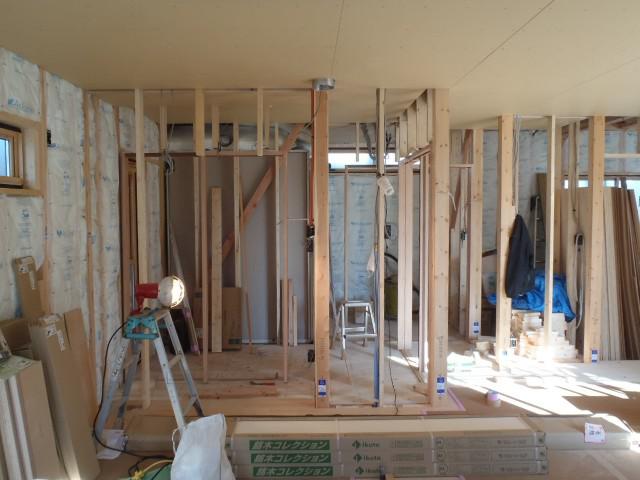 ・木工事、外壁下地材を打ち終え、壁断熱材入れ、床フローリング 貼りを進めています。 ・床貼り完了しましたら、壁ボード・下地合板貼り、ドア開口枠取付 と内部造作を進めます。
