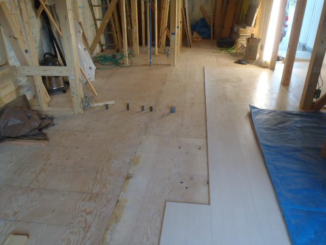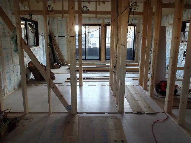 ・内部木工事、天井ボードを貼り終え、床フローリング貼りを行って