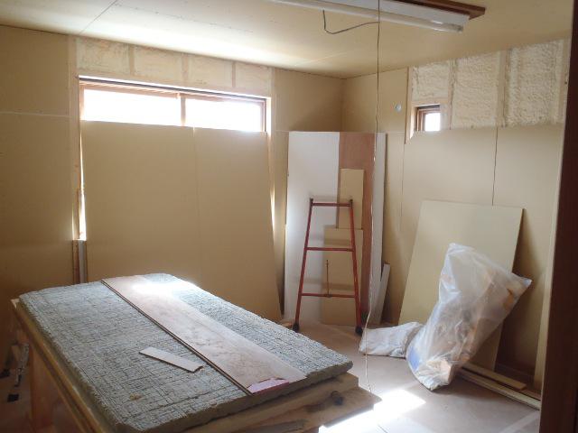 ・内部木工事 2階床フローリング貼りを行いながら、ドア開口枠 取付、床養生敷き込みと壁下地ボード貼りを行い1階LDK 天井下地組み及び天井ボード貼り、床フローリング貼りに入り ました。 25日ユニットバス据付を行います。