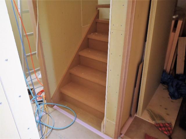 ・ 内部木工事、1階ドア枠・壁ボード張りを進めながら、 階段造作