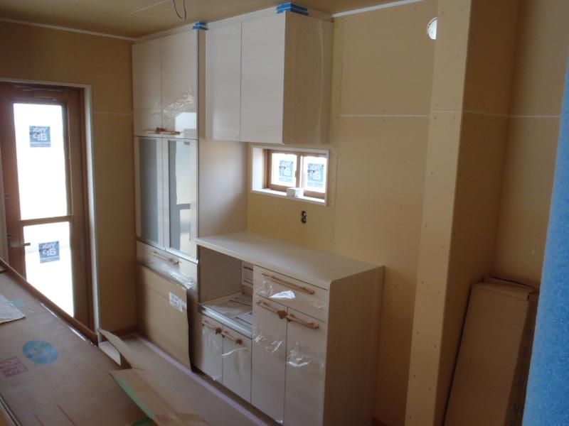 ・内部木工事、壁ボード貼り、幅木・回し縁取付を終え、固定棚・