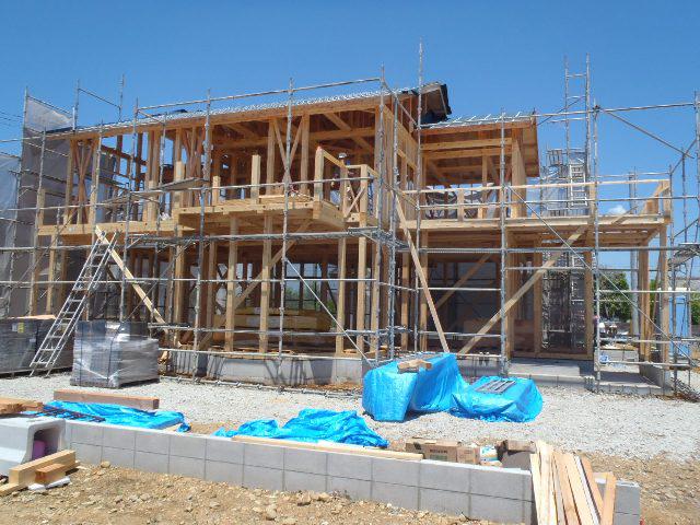 ☆先週の工事☆ 木工事(2階筋カイ・間柱入れ、窓開口、ベランダ下地、 下屋下地、他) ☆今週の予定工事☆ 木工事(1階筋カイ・窓開口、構造金物取付、他) 屋根工事(下屋ルーフィング敷き、瓦荷揚げ、 瓦桟打ち、瓦葺き)
