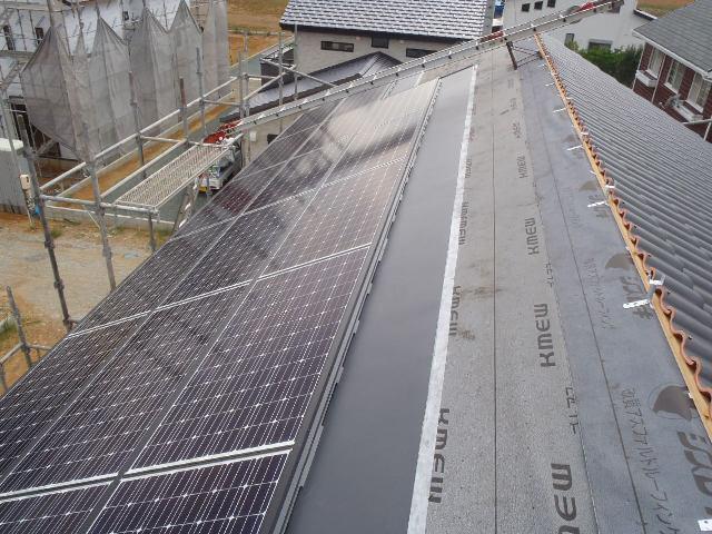 設置工事が完了しました、パネル周り瓦葺き、役物瓦取付に