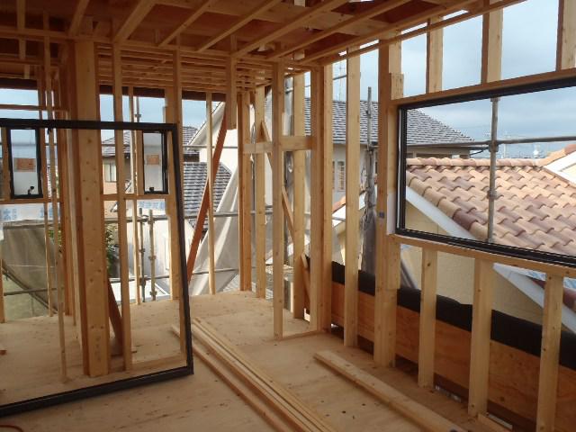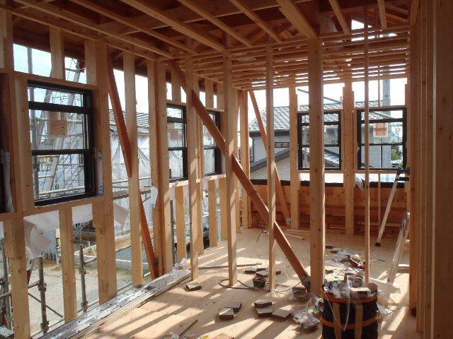 シート張り後、外壁下地材打ち、軒天工事、内部造作に取り掛