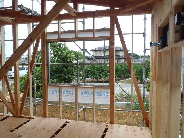 木工事、窓サッシ開口造作しサッシ取付、本筋カイ・間柱入れ、構造