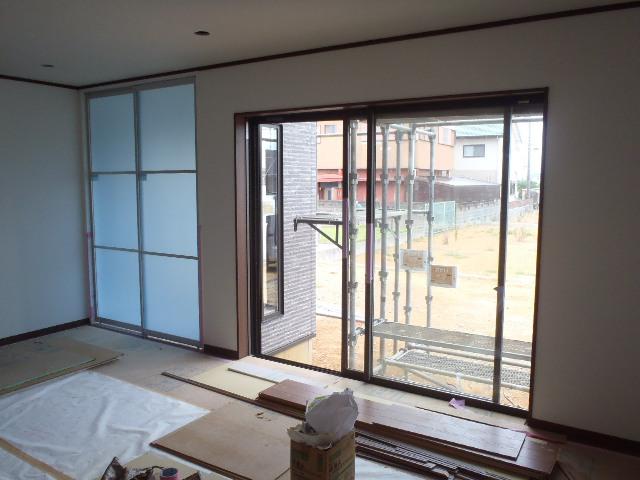 ・内部木工事、建具吊り込みを行い完了となります、内装 クロス・クッションシート張り完了となりました。 ・外壁工事 サイディング貼り建物9割程まで進んでいます、 サイディング貼り後 サイディングジョイント部、窓サッシ・ドア周りの コーキング材打ちし防水処理を進めて行きます。