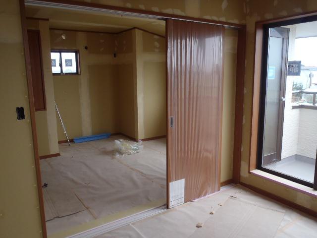 ・内装仕上げ工事、クロス下地、クロスパテを終えクロス張りを進めて