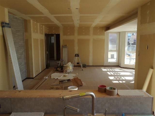 ・内装仕上げ、塗り壁上塗り完了、クロス貼りを進めています、