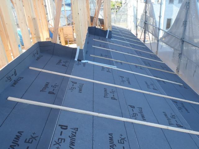 ・木工事、下屋根・木下地を終え防水紙(ゴムアスフェルト)葺き、 筋カイ・間柱入れ、ベランダ下地構造金物取付、行っています。