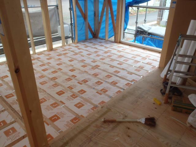 ・内部電気配線・配管、給排水給湯配管を進め、1階床断熱材