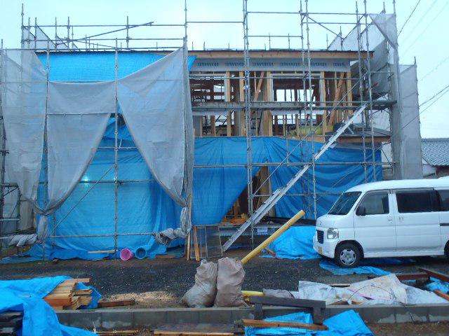 外壁下地シート張りを行い、ユニットバス外部断熱材入れ、壁ボード