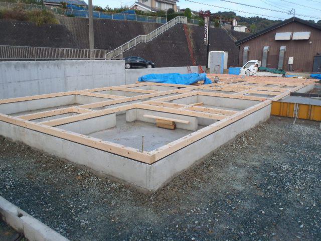 ☆先週の工事☆ 基礎工事(型枠解体、基礎周り埋め戻し整地、タイル下地 コンクリート、他) 土台据え、上棟準備 上棟 ☆今週の予定工事☆ 木工事(筋カイ・間柱入れ、構造金物取付、他)