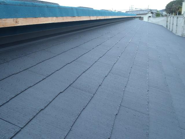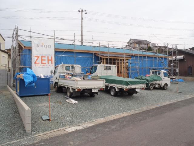 ・屋根工事、荷揚げしたカラーベストを葺き、太陽光パネル設置後、 廻りの部分を葺きます。 ・内部給排水・給湯配管を終え、床断熱材入れ・下地合板 本締め、軒天下地組みと木工事行っています。
