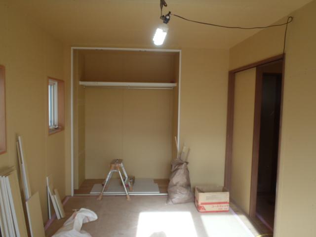 ・内部木工事、2階、壁下地合板、プラスターボード貼りがほぼ完了