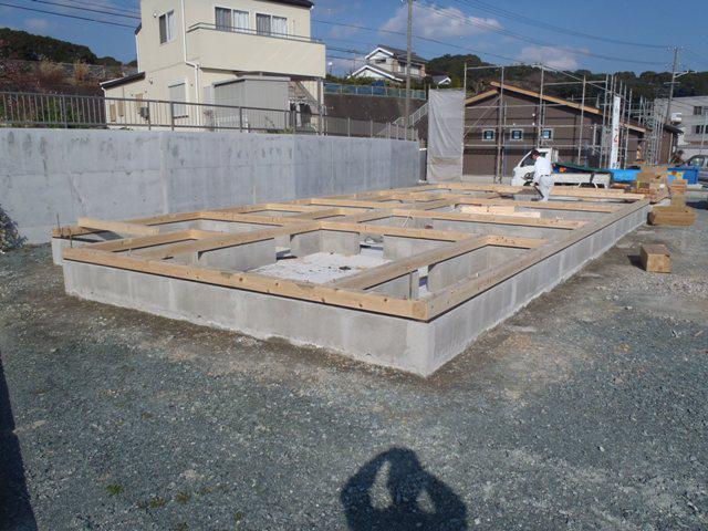 ・基礎コンクリートの色も白くなり強度が徐々に出てきています、 基礎に土台を据える基準墨を出し、基礎パッキン入れ、土台 据え、1階床下地組みと上棟準備を行っています。