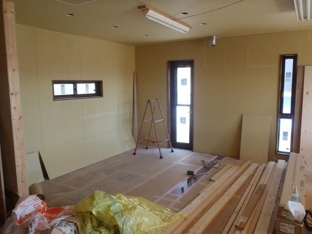 付けボード貼りを進め貼り終えた部屋より回し縁・幅木取付