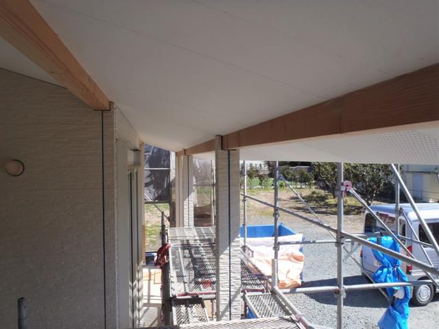 軒天取り合い部 防水コーキング処理へと進めます。 ・内部木工事、床フローリングを貼り終え養生き、窓枠組立・取付